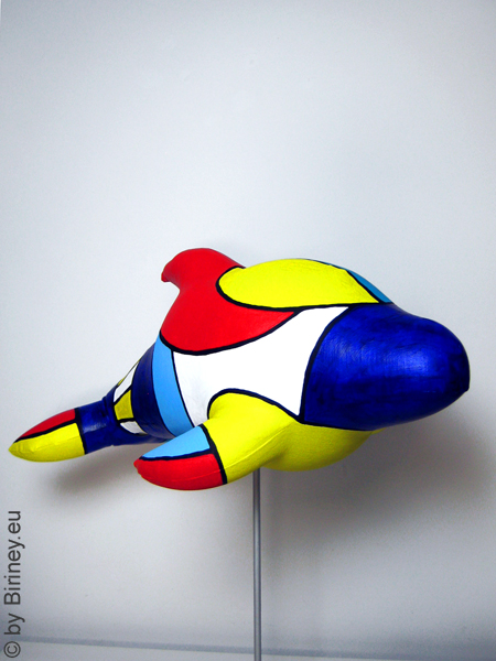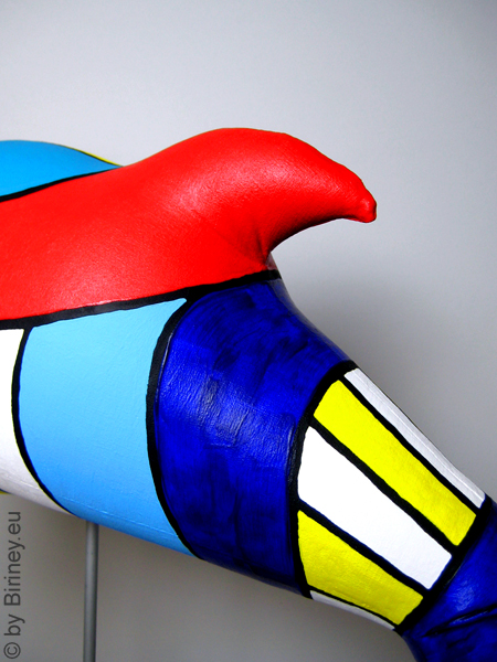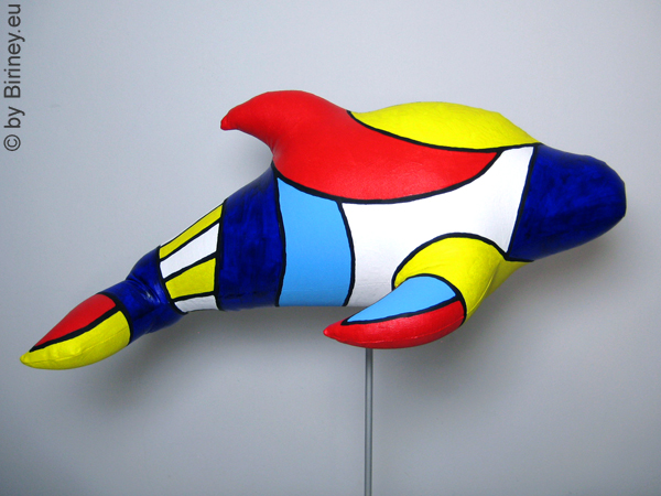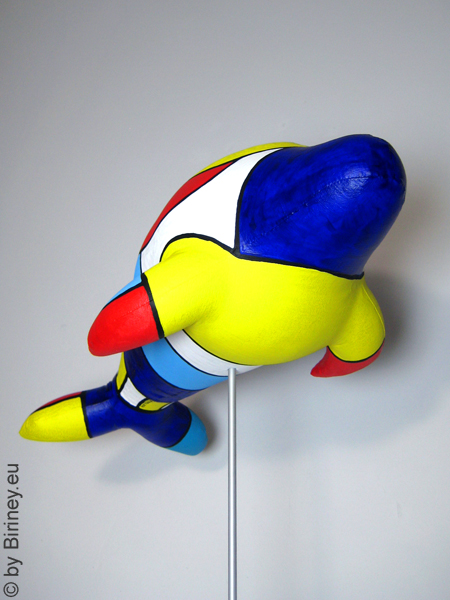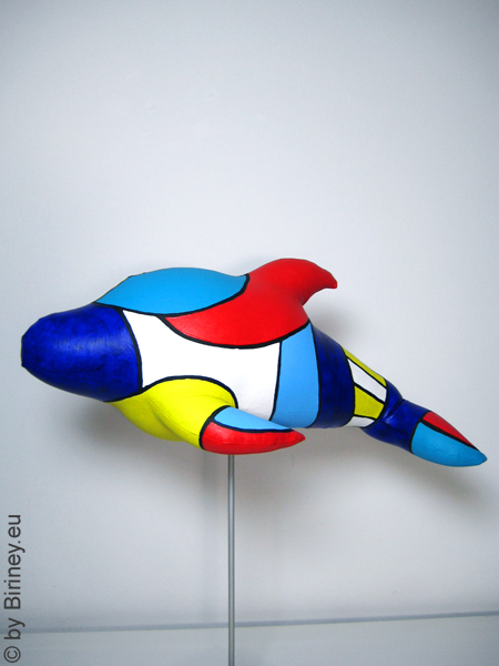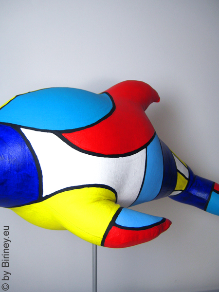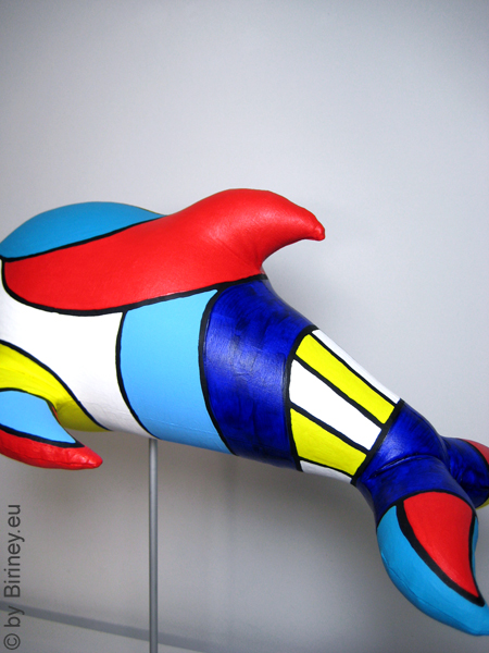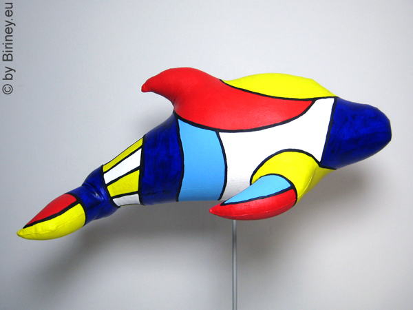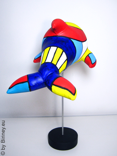 Länge 45cm, Unikat-Objekt Delphin-Figur, Leinwand auf Grundkörper, mehrfarbig abstrakt bemalt, für Kundin in Mönchengladbach / Deutschland.
