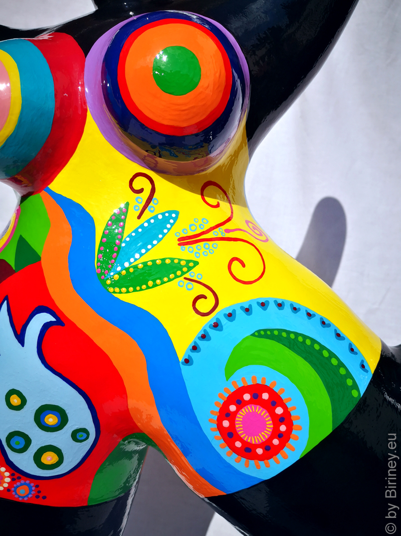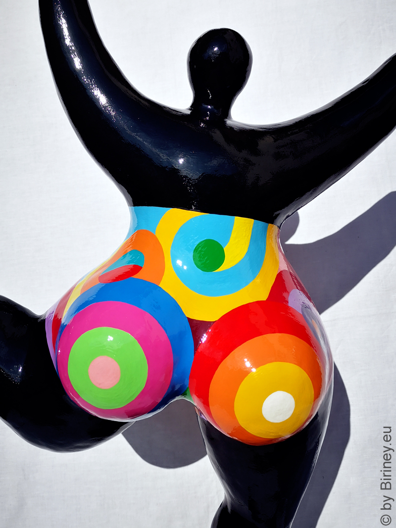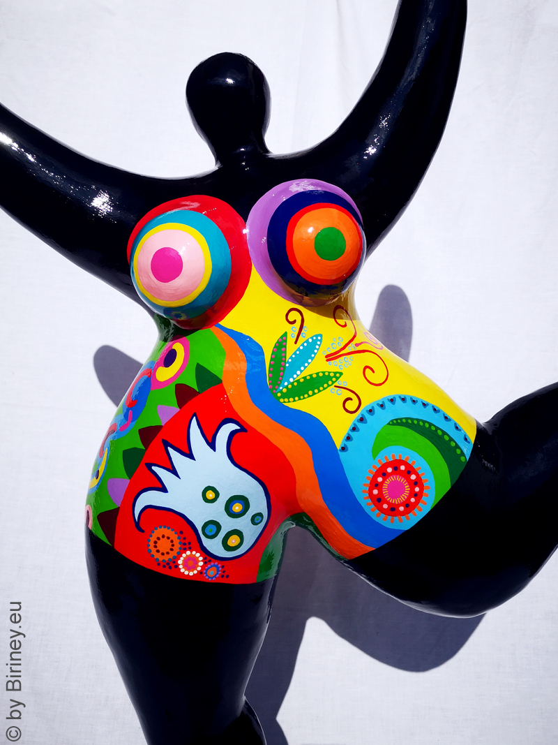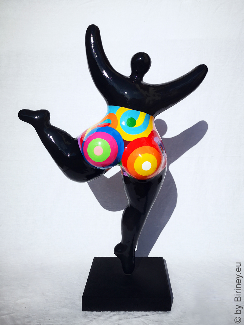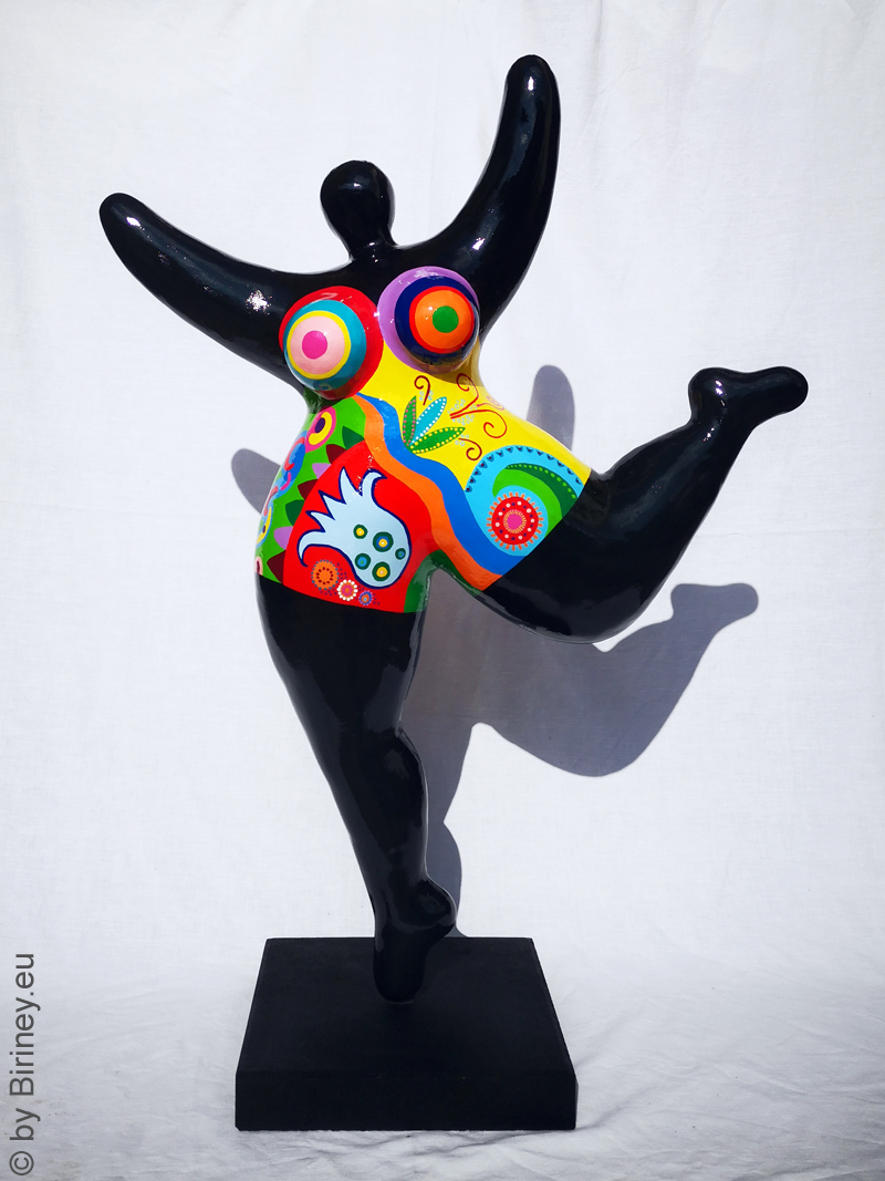 Höhe 98cm, Unikat-Objekt, Nana-Figur für den Außenbereich, modelliert aus Kunstharzmasse, Korpus schwarz, Badekleid bemalt mit floralen Motiven,  für Kunden in Wettin-Löbejün / Deutschland.